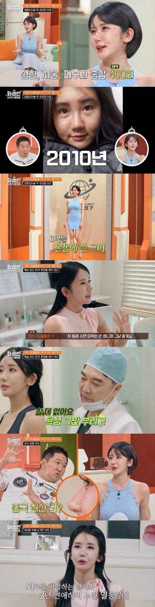 성형, 시술 비용은 어떻게 마련하냐는 질문에는 "사실 생활하기 전까지는 부모님이 많이 도와주셨다. 25세 때부터 리포터, 아나운서 하면서 사회생활 시작하면서부터는 내가 벌어서 했다. 하고 싶은 게 있으면 그만큼 벌었다. 일 진짜 열심히 한다. 지금은 온라인 마케팅 일을 하고 있다"며 "다른 데는 돈 안 쓴다. 물건 사는 것도 별로 안 좋아한다. 이게 나에 대한 투자라고 생각하고 후회는 없다"고 말했다.