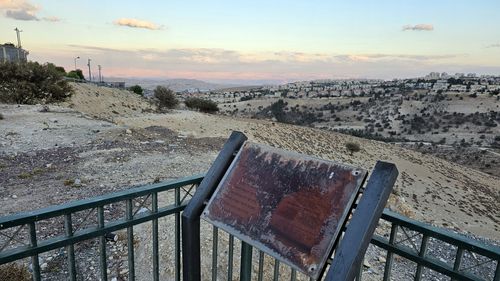 이 표지판 앞에 서니 언덕 아래로 건물이나 나무가 하나도 없어 동쪽 유대광야의 요르단계곡까지 시야가 탁 트였다. 높게 솟은 산봉우리들 뒤로 50㎞쯤 지점에 위치한 요르단 살트 마을까지 희미하게 보일 정도였다.
