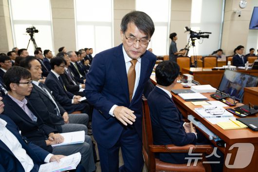 (서울=뉴스1) 유승관 기자 = 노태악 중앙선거관리위원장이 15일 서울 여의도 국회에서 열린 행정안전위원회의 중앙선거관리위원회 등에 대한 국정감사에 출석해 인사말 후 이석하고 있다. 2025.10.15/뉴스1