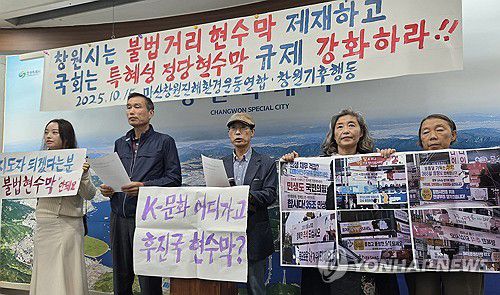 (창원=연합뉴스) 김선경 기자 = 15일 경남 창원시청 프레스센터에서 마창진환경운동연합과 창원기후행동이 기자회견을 열고 창원시에 불법 현수막 엄정 관리를 촉구하고 있다. 2025.10.15