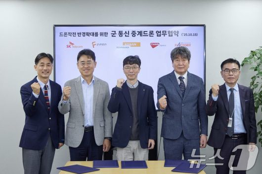 (서울=뉴스1) = SK텔레콤은 군사용 드론 작전 반경을 확대하기 위해 펀진, 코난테크놀로지, 콘텔라, 플랙토리와 통신 중계 드론 개발 업무협약(MOU)을 체결했다고 밝혔다. 15일 서울 중구 SKT 남산사옥에서 나경환 SKT 엔터프라이즈솔루션본부장, 김정훈 펀진 사업전략본부장, 김규훈 코난테크놀로지 국방AI사업부장, 김태연 콘텔라 MTS사업부문장, 김태훈 플랙토리 대표이사가 기념 촬영을 하고 있다. (SK텔레콤 제공. 재판매 및 DB 금지) 2025.10.15/뉴스1