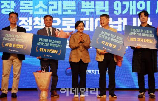 [이데일리 김태형 기자] 한성숙(가운데) 중소벤처기업부 장관이 15일 서울 상암동 중소기업DMC타워에서 열린 ‘소상공인 회복 및 안전망 강화’를 위한 열 번째 간담회에 참석해 '소상공인의 목소리를 담은 정책' 시상을 하고 있다.
