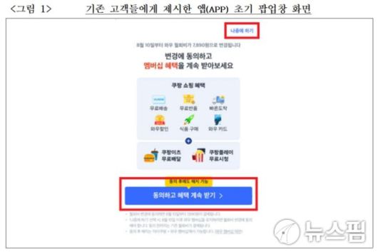 구체적으로 쿠팡은 가격인상에 즉시 동의한다는 내용의 '동의하고 혜택 계속 받기' 버튼을 소비자들이 쉽게 인지할 수 있도록 중앙 하단에 청색 바탕 버튼으로 크게 제시했다.