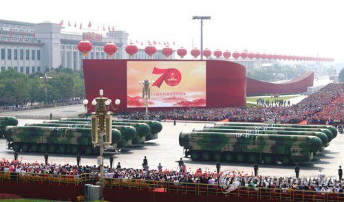 (서울=연합뉴스) 이세원 기자 = 중국은 2019년 10월 열린 건국 70주년 국경절 열병식에서 차세대 대륙간탄도미사일(ICBM) '둥펑(東風)-41'(DF-41)을 선보였다. 거대한 미사일은 무력의 아이콘이었다.