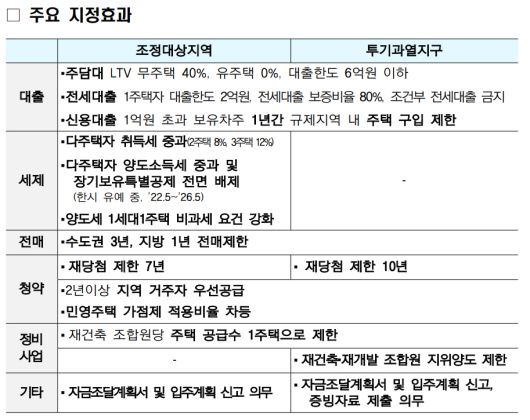 조정대상지역과 투기과열지구의 경우 대출과 세제, 청약 등 전 부문에서 규제가 강화된다.