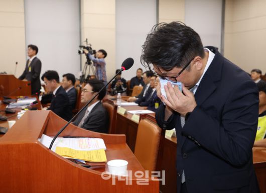 [이데일리 노진환 기자] 문지석 검사가 15일 서울 여의도 국회에서 열린 기후에너지환경노동위원회의 고용노동부 등에 대한 국정감사에 출석, 쿠팡CFS 퇴직금 미지급 검찰 수사 관련 질의에 답변하며 눈물을 흘리고 있다.