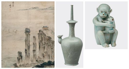 간송미술관 '보화비장'전에 선보이는 미술품들. 왼쪽부터 겸재 정선의 '금강산 8폭' 중 '총석정', 12세기 작품인 '청자상감연지원앙문정병'(국보)와 청자모자원숭이형연적(국보). 간송미술문화재단 |