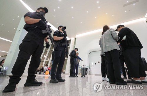 (영종도=연합뉴스) 서대연 기자 = 캄보디아에서 한국인 납치·구금 사태가 발생해 논란을 빚고 있는 가운데 15일 인천국제공항 제2여객터미널 탑승구에서 인천국제공항 경찰단 대테러기동대와 안보팀 관계자들이 캄보디아행 항공편 한국인 승객들을 대상으로 위험방지를 위한 안전활동을 하고 있다. 2025.10.15