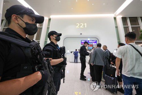 (영종도=연합뉴스) 서대연 기자 = 캄보디아에서 한국인 납치·구금 사태가 발생해 논란을 빚고 있는 가운데 15일 인천국제공항 제2여객터미널 탑승구에서 인천국제공항 경찰단 대테러기동대 대원들과 안보팀 관계자들이 캄보디아행 항공편 한국인 승객들을 대상으로 위험방지를 위해 질의응답 등 안전활동을 하고 있다. 2025.10.15