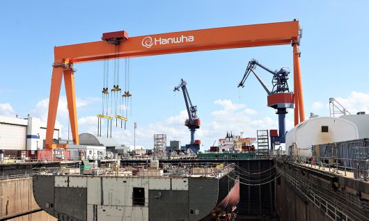 미국과 중국의 통상 갈등이 희토류 등에 이어 조선 분야까지 번지면서 양국 사이에 낀 한국 조선 업체가 곤경에 처했다. 중국 정부가 지난 14일 한·미 조선 협력 사업인 ‘마스가’(MASGA·미국 조선업을 다시 위대하게)의 핵심으로 꼽히는 한화오션의 미국 자회사 다섯 곳을 겨냥한 제재 조치를 발표한 것은 한국에 대해 미국과 너무 밀착하지 말라는 경고라는 분석이 나온다. 사진은 미국 펜실베이니아주 필라델피아의 한화필리조선소 모습.