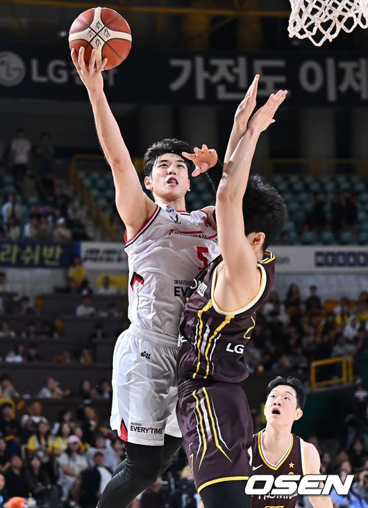 [OSEN=창원, 이석우 기자] 15일 창원 체육관에서 2025-2026 LG전자 프로농구 창원 LG와 안양 정관장의 경기가 열렸다. LG의 외곽을 책임지는 유기상이 2번째 4경기 연속 3점슛 5개+ 성공 기록에 도전한다. 안양 정관장 변준형이 창원 LG 유기상의 마크를 피해 골밑슛을 시도하고 있다. 2025.10.15 / foto0307@osen.co.kr