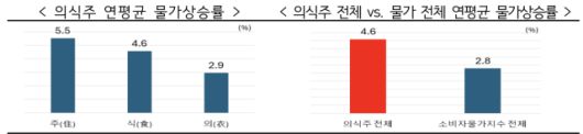 최근 5년간 의식주 물가는 연평균 4.6% 상승, 같은 기간 소비자물가 상승률(연평균 2.8%)보다 1.8%포인트 높았다. 한경협은 민생과 직결된 의식주 물가의 가파른 상승으로 서민들의 체감물가 부담이 컸을 것이라고 설명했다.