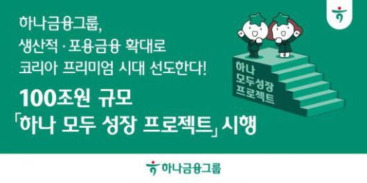 하나금융그룹은 84조원 규모의 생산적 금융 및 16조원 규모의 포용금융 공급을 통해 금융의 본질적 역할과 사회적 책임을 강화하기 위한 '하나 모두 성장 프로젝트'를 적극 추진하기로 했다.