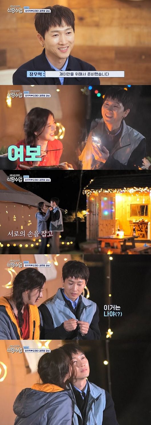 식사 후 두 사람은 모닥불을 피워놓고 낭만에 젖었다. 장우혁은 들국화의 ‘매일 그대와’를 틀어놓은 뒤 오채이의 손을 잡고 춤을 추기도 했다. 그러면서 그는 “오늘 음식이 맛도 맛인데 채이가 날 생각해주는 느낌을 많이 받았다. 저 노래처럼 매일 이런 음식을 해주는 사람이 있으면 얼마나 좋을까?”라고 고백하며 미리 준비해온 ‘커플 반지’를 내밀었다. 귀여운 비즈 반지에 오채이는 뭉클해했고, 장우혁은 ‘아기 반지’라며 오채이의 새끼손가락에 작은 반지를 하나 더 끼워줘 ‘프러포즈’급 이벤트를 선사했다.