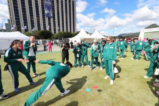 문화체육관광부와 한국관광공사가 서울 광화문광장에서 외국인 관광객 80여명을 초청해 체험형 이벤트 ‘오징어게임 핑크가드와 함께하는 K-게임 데이'를 펼쳤다고 16일 밝혔다.