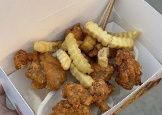 SNS에 글과 함께 올라온 사진을 보면 1만 원이라는 음식 상자에는 닭강정 몇 조각과 감자튀김이 소량 들어 있다.