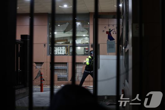 19일 새벽 윤석열 대통령에 대한 구속영장 발부 소식에 서울 서부지법에 지지자들이 진입해 난동을 부려 유리창과 외벽이 깨져 있다. 2025.1.19/뉴스1 ⓒ News1 민경석 기자 |