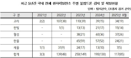16일 이해민 국회의원(조국혁신당)이 원자력안전위원회로부터 제출받은 자료에 따르면 2021년부터 2025년 8월까지 원전 인근에서 탐지된 불법드론은 699건, 이중 40%가 넘는 284건은 조종자 신원이 확인되지 않는 것으로 나타났다.