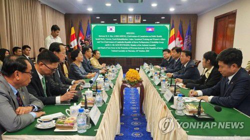 (서울=연합뉴스) 더불어민주당 재외국민안전대책단이 16일(현지시간) 캄보디아 프놈펜에서 현지 하원 의원들과 면담하고 있다. 2025.10.17 [더불어민주당 재외국민안전대책단 제공. 재판매 및 DB 금지]