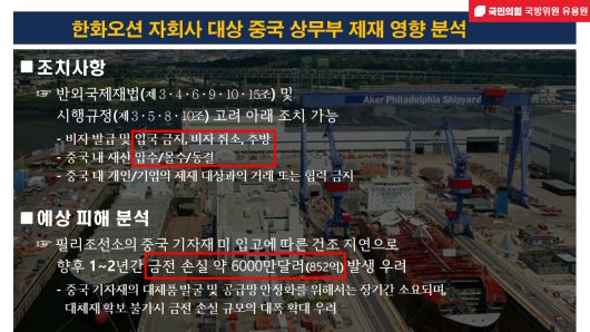 유용원 국민의힘 의원은 17일 중국 상무부의 최근 필리조선소를 포함한 한화오션 미국 내 5개 자회사 제재와 관련 “한미 조선협력의 핵심 사업인 ‘마스가’(MASGA) 프로젝트 전반에 직접적 영향을 미칠 수 있다”며 “필리조선소는 향후 1~2년간 약 6000만 달러의 피해가 발생할 것으로 추정된다”고 밝혔다. [유용원 의원실 제공] |