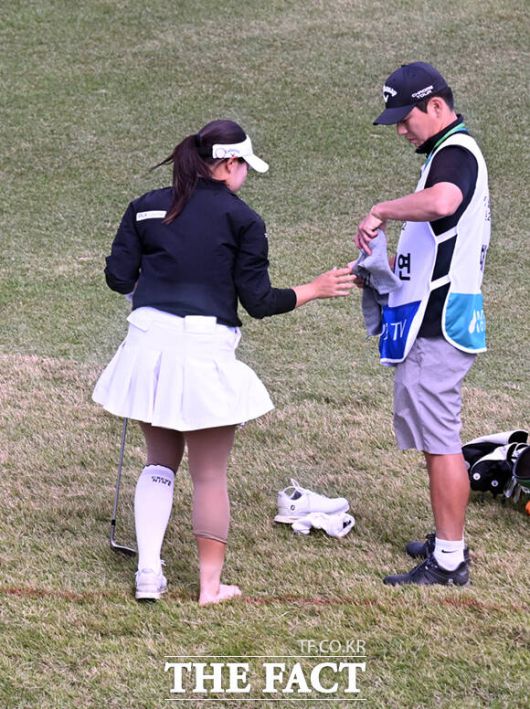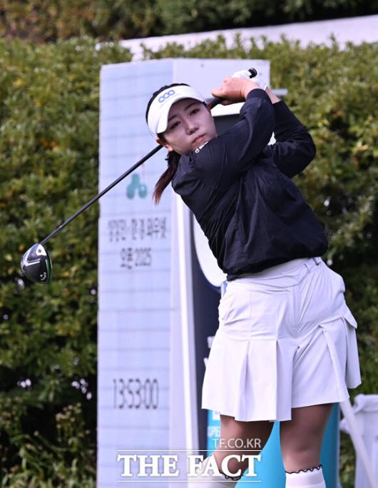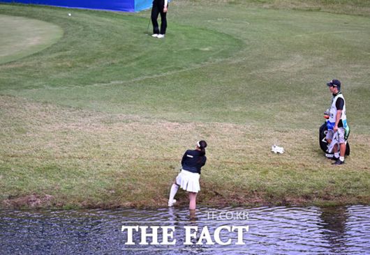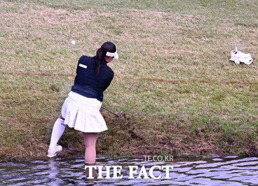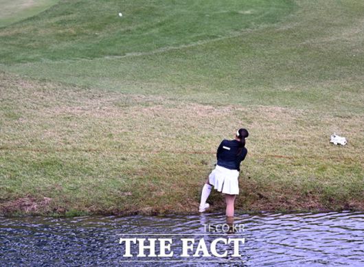 [더팩트ㅣ양주=이새롬 기자] 강채연이 17일 경기 양주 레이크우드CC에서 열린 KLPGA(한국여자프로골프)투어 '상상인·한경 와우넷 오픈 2025' 2라운드 경기에 참가해 18번홀에서 해저드 인근에 안착한 볼을 쳐내고 있다.