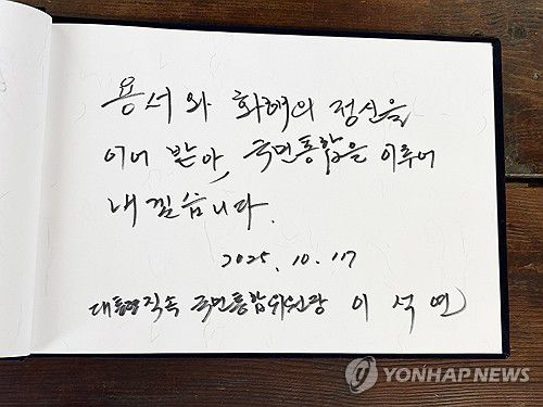 (서울=연합뉴스) 이석연 국민통합위원장이 17일 전남 신안군 하의도 고 김대중 대통령 생가를 방문해 작성한 방명록. 2025.10.17 [국민통합위원회 제공. 재판매 및 DB 금지]