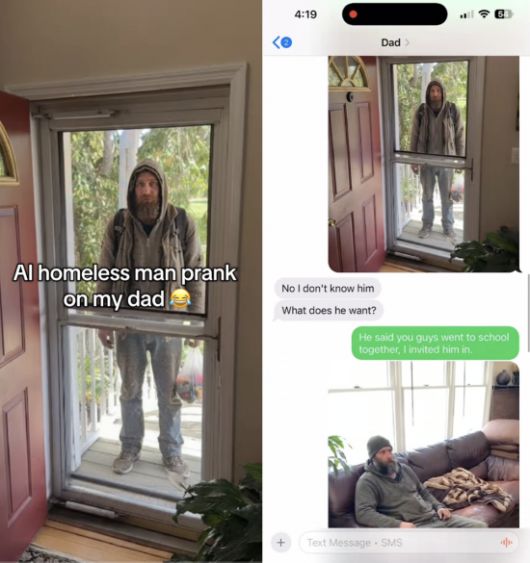 17일(현지시간) ABC 뉴스 등 외신은 "최근 사회관계망서비스(SNS)를 중심으로 AI 이미지 생성기로 만든 노숙자 남성이 문 앞에 서 있는 사진을 지인에게 보내는 장난이 퍼지고 있다"고 보도했다. 장난을 시작한 사람들은 해당 사진을 친구나 가족에게 전송해 놀라게 한 뒤 상대가 놀라 911에 신고하거나 패닉에 빠지는 반응을 촬영해 온라인에 공유한다.