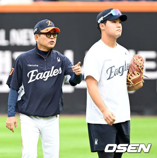 [OSEN=대전, 이대선 기자] 17일 오후 대전 한화생명볼파크에서 2025 신한 SOL Bank KBO리그 포스트시즌 플레이오프 1차전 한화 이글스와 삼성 라이온즈의 경기가 열렸다. 한화는 폰세, 삼성은 가라비토를 선발 투수로 내세웠다. 경기에 앞서 한화 양상문 코치가 캐치볼을 하는 정우주를 바라보고 있다. 2025.10.17 /sunday@osen.co.k
