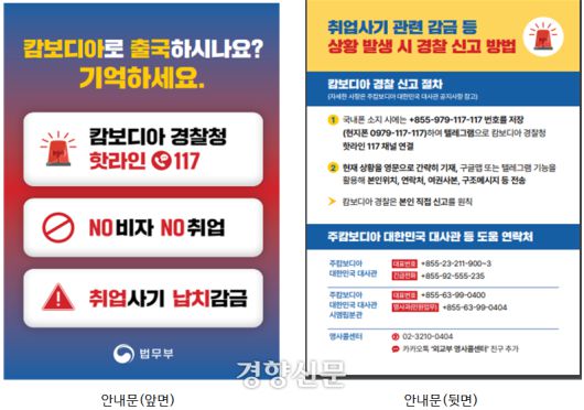 법무부는 17일부터 인천국제공항에서 캄보디아로 출국하는 국민이 출국 초기 단계에서부터 현지 취업사기 등 위험을 인지할 수 있도록 안내하는 조치를 시행했다고 밝혔다.