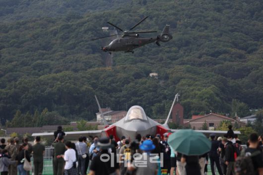 [이데일리 이영훈 기자] 7일 경기도 성남시 서울공항에서 열린 '서울 국제항공우주 및 방위산업 전시회(ADEX)'에서 LAH 소형무장헬기가 비행하고 있다.