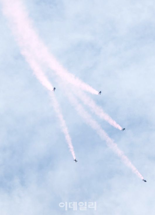 [이데일리 이영훈 기자] 7일 경기도 성남시 서울공항에서 열린 '서울 국제항공우주 및 방위산업 전시회(ADEX)'에서 공군 특수부대 고공강하팀의 시범이 진행되고 있다.