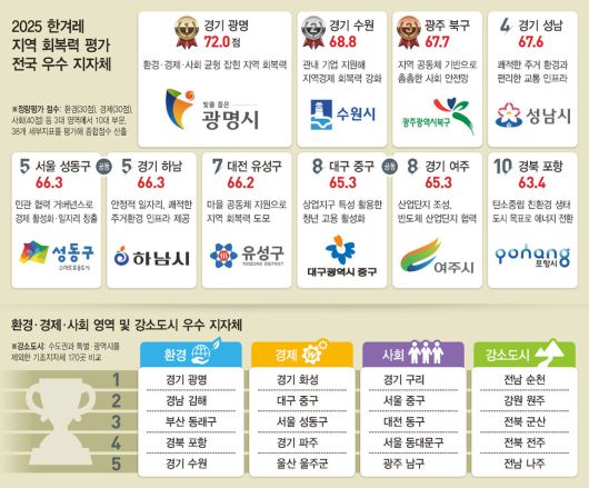 한겨레경제사회연구원이 올해 처음 발표한 한겨레 지역 회복력 평가는 환경·경제·사회 등 3대 영역과 10개 부문, 38개 세부지표를 바탕으로 각 지방자치단체의 지속가능성과 위기 대응 역량을 종합적으로 분석했다.
