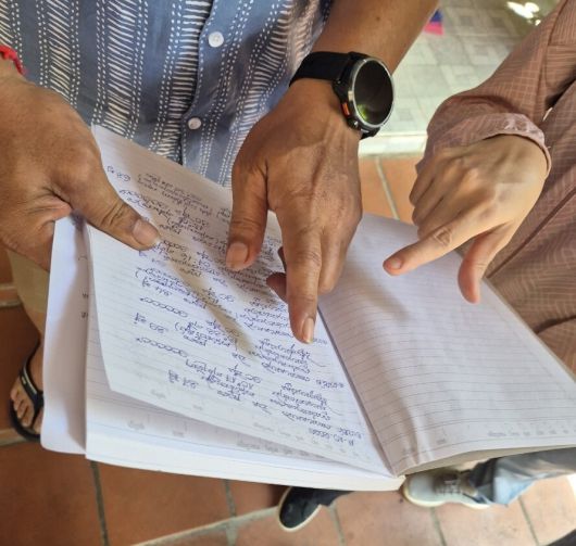 17일 오전 캄보디아 프놈펜 턱틀라 사원 관계자가 최근 일주일간 화장한 이들의 이름과 사인 등을 적은 노트를 펼쳐 보이고 있다. 정인선 기자 |