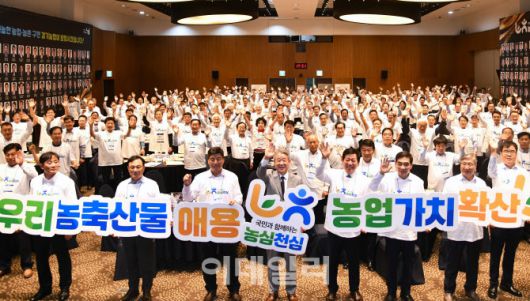 [이데일리 김태형 기자] 강호동(앞줄 왼쪽 네번째부터) 농협중앙회장과 박경식 안산농협 조합장 등 참석자들이 16일 경기도 양평군 블룸비스타 컨퍼런스홀에서 열린 2025 경기농협 조합장 포럼에서 '농심천심운동' 추진 결의대회를 하고 있다.