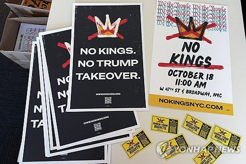 (워싱턴=연합뉴스) 이유미 특파원 = 도널드 트럼프 대통령의 국정 운영 방식에 반대하는 '노 킹스'(No Kings·왕은 없다) 시위가 18일(현지시간) 미국 전역에서 진행된다고 워싱턴포스트(WP)와 뉴욕타임스(NYT) 등이 17일 보도했다.