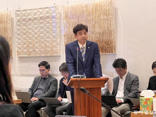 미국 뉴욕 맨해튼 주 유엔 한국대표부에서 열린 국정감사에서 차지훈 주 유엔대사가 모두발언을 하고 있다. 뉴욕=임우선 특파원 |