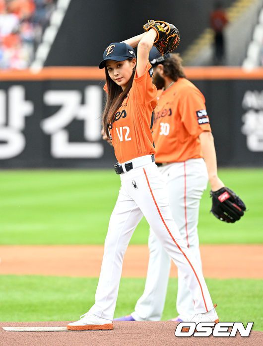 [OSEN=대전, 이대선 기자] 18일 오후 대전 한화생명볼파크에서 2025 신한 SOL Bank KBO리그 포스트시즌 플레이오프 1차전 한화 이글스와 삼성 라이온즈의 경기가 열렸다. 한화는 폰세, 삼성은 가라비토를 선발 투수로 내세웠다. 경기에 앞서 가수 겸 배우 유리가 시구를 하고 있다. 2025.10.18 /sunday@osen.co.kr