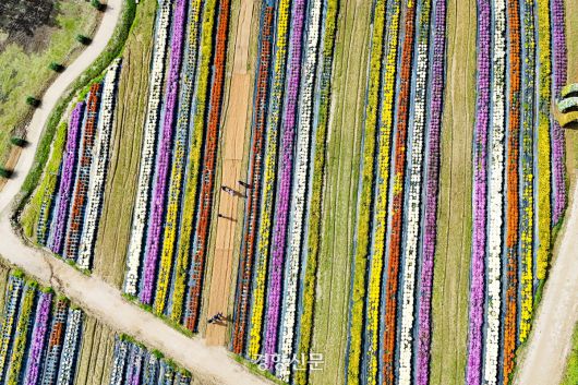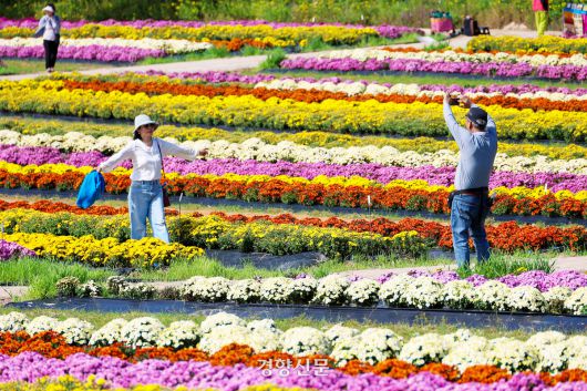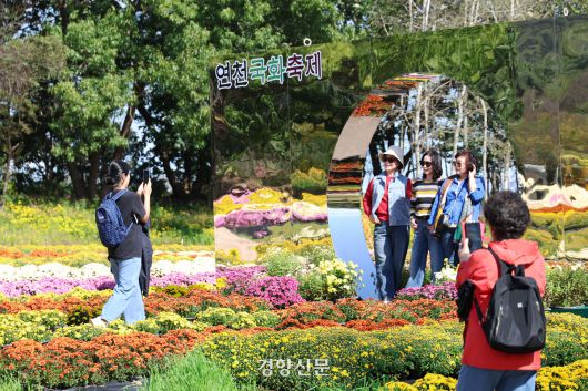 경기 연천군 연천전곡리유적에서 국화축제가 열린 17일 시민들이 꽃구경하고 있다. 한수빈 기자 |