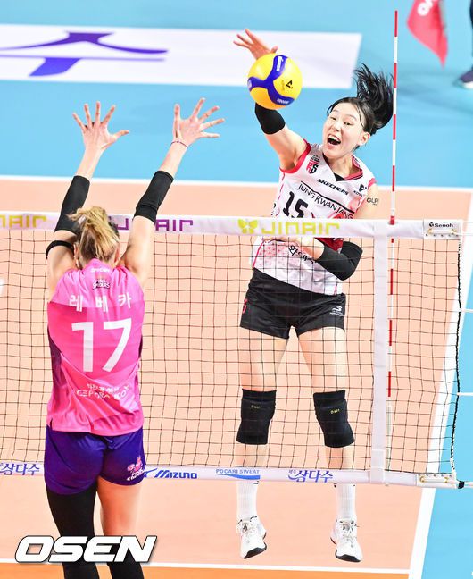 [OSEN=인천, 박준형 기자] 18일 오후 인천삼산체육관에서 프로배구 진에어 2025-2026 V리그 여자부 흥국생명과 정관장의 경기가 진행됐다. 올시즌 앞두고 흥국생명은 김연경이 은퇴하고 이다현을 영입했다. 반면 정관장은 표승주가 은퇴했다. 2세트 정관장 이선우가 강타를 날리고 있다. 2025.10.18 / soul1014@osen.co.kr
