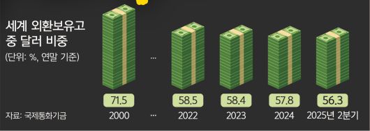미국 국가채무는 지난 8월 사상 처음으로 37조달러를 돌파하며 빠른 속도로 불어나고 있다. 국제통화기금(IMF)에 따르면 2000년대 초 약 70%에 달했던 달러화 외환보유 비중은 최근 38% 수준까지 하락했다. 이는 달러화에 대한 신뢰가 시험대에 오르고 있음을 보여준다.