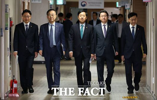 구윤철 부총리 겸 기획재정부 장관(가운데)과 김윤덕 국토교통부 장관, 윤창렬 국무조정실장, 이억원 금융위원장, 임광현 국세청장이 지난 15일 오전 서울 종로구 정부서울청사에서 열린 주택시장 안정화 대책 관계부처 합동브리핑에 참석하고 있다. /임영무 기자 |