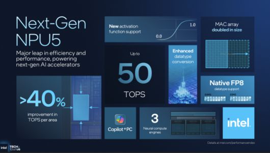 팬서레이크의 NPU 5(Neural Processing Unit 5)는 루나레이크의 NPU 4를 완전 재설계한 형태다. FP8 데이터타입과 강화된 데이터 컨버전 파이프라인(Data Conversion Pipeline), 프로그램형 활성화 함수 룩업 테이블(LUT)을 갖췄다.