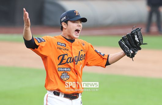 한화 이글스는 18일 대전 한화생명볼파크에서 열린 '2025 신한 SOL뱅크 KBO 포스트시즌' 삼성 라이온즈와 플레이오프 1차전에서 역전과 재역전을 반복한 끝에 9-8로 이겼다. 9회초 마지막 아웃카운트가 올라간 시점까지 득점권에 주자가 있는 치열한 승부였다. 플레이오프 엔트리 30명 가운데 외국인 선수 3명을 포함해 무려 20명이 KBO 포스트시즌 경험이 없는 선수들로 채워진 한화가 이런 접전에서도 승리를 지켰다.