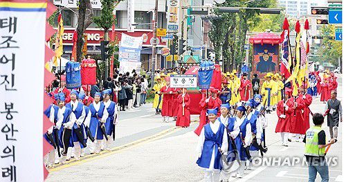 (전주=연합뉴스) 18일 전북 전주시 완산구 노송광장과 충경로 일대 등에서 태조어진 봉안 의례가 재현되고 있다. 태조어진 봉안 의례는 1688년(숙종 14년)의 봉안 의례의 고증을 거쳐 재현한 것으로, 조선 왕조의 본향이자 태조어진 진본이 모셔진 전주에서만 볼 수 있는 전통문화 콘텐츠이다. 2025.10.19 [전주시 제공. 재판매 및 DB 금지]