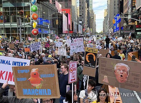 (뉴욕=연합뉴스) 이지헌 특파원 = 18일(현지시간) 미국 뉴욕 맨해튼에서 도널드 트럼프 미 대통령에 반대하는 '노킹스' 시위 참가자들이 피켓을 들고 행진하고 있다. 2025.10.18