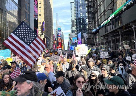 (뉴욕=연합뉴스) 이지헌 특파원 = 18일(현지시간) 미국 뉴욕 맨해튼에서 도널드 트럼프 미 대통령에 반대하는 '노킹스' 시위 참가자들이 피켓을 들고 행진하고 있다. 2025.10.18