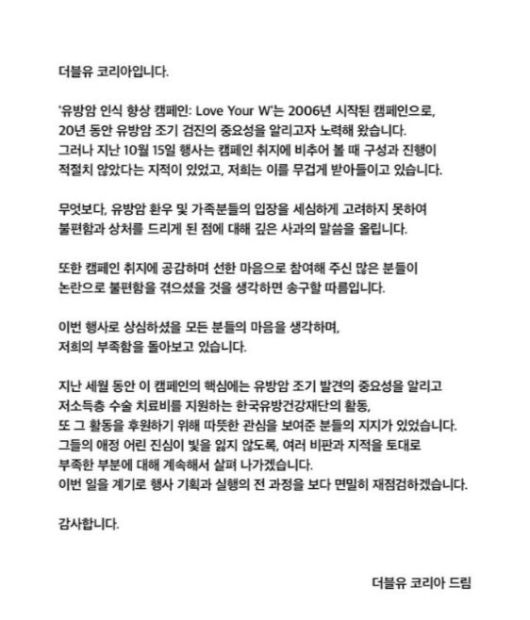 ‘유방암 인식 향상 캠페인: Love Your W’는 2006년 시작된 캠페인으로, 20년 동안 유방암 조기 검진의 중요성을 알리고자 노력해 왔습니다. 그러나 지난 10월 15일 행사는 캠페인 취지에 비추어 볼 때 구성과 진행이 적절치 않았다는 지적이 있었고, 저희는 이를 무겁게 받아들이고 있습니다.