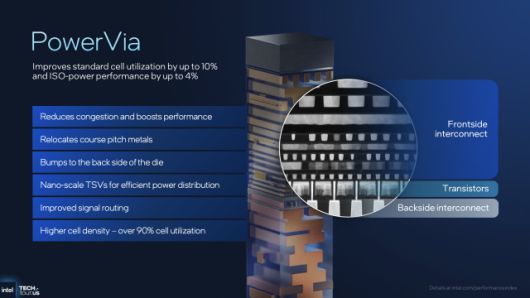 이 다층 구조의 핵심은 베이스 타일(Base Tile)이다. 베이스 타일은 전체 시스템의 전력 분배망(PDN, Power Delivery Network)과 메모리 컨트롤러, L3 캐시 블록이 통합된 영역이다. 클리어워터 포레스트는 18A 공정 기반의 파워비아(PowerVia) 기술을 통해 전력선을 칩 후면으로 재배치함으로써, 베이스 타일 상단의 신호층 밀도를 높였다. 덕분에 EMIB를 통해 연결되는 컴퓨트 타일(Compute Tile) 간 신호 전송이 기존 대비 30% 이상 빨라졌고, 전력 효율은 25% 개선됐다.