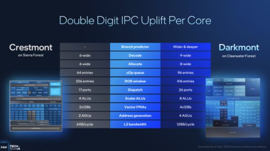 클리어워터 포레스트(Clearwater Forest)는 인텔의 서버용 E코어 설계가 성숙 단계에 이르렀음을 보여주는 프로세서다. 이 제품은 전 세대 시에라 포레스트(Sierra Forest)의 크레스트몬트(Crestmont) 코어를 계승하면서도, 내부 실행 파이프라인과 캐시 계층, 전력 관리 방식이 전면 재구성됐다. 그 중심에는 인텔이 ‘다크몬트(Darkmont)’라 부르는 차세대 효율 코어가 자리한다.