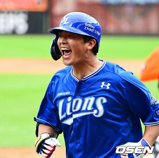 [OSEN=대전, 지형준 기자] 18일 오후 대전 한화생명볼파크에서 2025 신한 SOL Bank KBO리그 포스트시즌 플레이오프 1차전 한화 이글스와 삼성 라이온즈의 경기가 열렸다.한화는 폰세, 삼성은 가라비토를 선발 투수로 내세웠다.4회초 무사에서 삼성 김태훈이 역전 솔로포를 날리며 기뻐하고 있다. 2025.10.18 /jpnews@osen.co.kr
